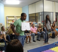 “Não há lugar específico para contar histórias, pode ser em casa, na biblioteca, na rua ou na praça. O importante é envolver a plateia, fazer com que ela conte a história junto a você seja por meio de músicas ou mesmo de palpites em determinadas partes da narração. Dessa forma é possível passar mensagens importantes, mas de forma lúdica. A ferramenta contação de histórias é válida mesma nessa era de informática. O mundo sempre precisará da imaginação”, diz aos estudantes o contador de história Tarcísio Bruno.